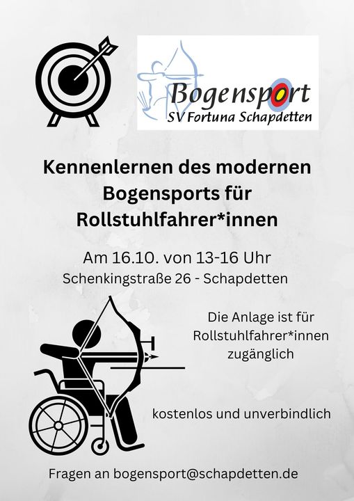 Sonntag, 16.10.22 von 13.00 - 16.00 Uhr sind alle interessierten Rollstuhlfahrer:innen eingeladen den Bogensport kennenzulernen.